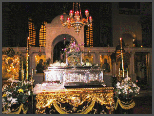 Es handelt sich um ein holzgedecktes Gebäude ohne Kuppel, mit den Grundriss maßen 43,58 m. Länge und 33 m. Breite. Innen wird sie durch 4 marmorne Säulenreihe in 5 Schiffe unterteilt, während ein 6. Schiff den fünf anderen horizontal vorgelagert ist, in dem Altar und das Allerheiligste sind. Das Mittelschiff breiter als die vier übrigen, ist erhöht und beherrschend. Die Seiten sind stufenweise überdacht und geben so die Möglichkeit zur Bildung von vielförmigem Fenster an den Seitenwänden. ( ein bis mehrflügelige Fenster ). Im größten Teil des Bauwerkes ist die alte Mauerfugung aus ungleich zusammengefügten Steinen und Backsteinen erhalten, die kunstvolle Bogen und Fenster bildet. Als 342 nach Chr. Konstantin der Große das Christentum zur Staatskirche erklärte, bauten die Thessalonicher schnell zu Ehren ihres Märtyrers eine kleine Kirche ( Oikiskos ). Sie lag in der Nähe der Keller eines verlassenen römischen Bades, neben dem Stadion der Stadt. Dort soll nach der Überlieferung auch das Martyrium des Heiligen stattgefunden haben und dort soll er auch begraben sein. Es dauerte nicht lange und die kleine Kirche war das Zentrum der Verehrung des Heiligen. nicht nur für die Thessalonicher, sondern für die gesamte Christenheit. Viele Gläubige kamen nach Thessaloniki um am Grab des Heiligen zu beten und von der aus dem Grab fließende Myrrhe, von schweren Krankheiten geheilt zu werden. Unter den Pilgern war auch der Gouverneur von Illyriens Leontios aus Sirmio, der von seiner Krankheit geheilt wurde. Aus Dank ließ Leonitios dem Heilligen 413 an Stelle der kleinen Kirche eine große neue erbauen. Das Gebäude beherrschte ganz Thessaloniki, da es am Fuß des Hügels der Oberstadt lag. Die Kirche mit verschiedenen Reparaturen und Umbauten, blieb bis zum großen Brand 1917 erhalten. Sie wurde dann abgerissen um später in ihrer ursprünglichen Form mit erhaltenen Originalteilen wieder aufgebaut zu werden. |