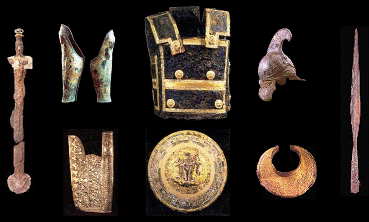 Faszinierend zeigt sich dem Betrachter eine komplette Waffenausrüstung eines wahrscheinlich adligen Kriegers, die auch nach über zwei Jahrtausenden kaum etwas von ihrem ursprünglichen Aussehen verloren hat. Die künstlerische Ausführung und die verwendeten Materialien ( Gold, Silber, Elfenbein, Eisen und Bronze) geben Zeugnis von einer hohen Kunstfertigkeit. Auf Grund des vorhandenen Zierrat handelt es sich wahrscheinlich um zeremonielle Waffen. Der mit goldenen Reliefbänder und mit Löwenköpfen verzierte eiserne Brustpanzer, ist der einzige aus der Zeit der Antike und ähnelt der Rüstung, die Alexander der Große trägt, dargestellt auf dem berühmten Wandmosaik von Pompei, ausgestellt im archäologischen Museum von Neapel. |