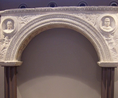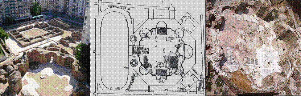 Im Süd-Westabschnitt der Palastanlage fand man ein großes achteckiges Gebäude das Oktagon, dessen Benutzung noch nicht geklärt ist. Vielleicht handelt es sich um den Thronsaal des Galeriuspalastes oder um ein Kaisermauseleum oder Tempel. Das Oktagon hat im Inneren 7 Nischen, einen großen Vorraum und runde Tribünen. Der Fußboden des ungefähr 30 m im Durchmesser messenden Gebäudes, war mit wunderbar angeordneten Marmorplatten gedeckt. Ein Teil des Bodenbelags und viele Elemente der Innenverzierung sind erhalten und lassen mit Sicherheit Rückschlüsse auf die Ästhetik des übrigen Komplexes zu. In diesem Raum fand man einen unversehrten Marmorbogen mit einem Durchmesser von 2,5 m, mit reicher gemeißelter Verzierung. Die rechte Seite zeigt in einem kreisrunden Rahmen, den römischen Kaiser Galerius, während die linke Seite und wieder in einem Kreis seine Frau Galeria Valeria, Tochter Diokletians, deren Bildnis später in dasjenige der personifizierten Stadt Thessaloniki (Stadtgöttin) umgearbeitet wurde. Der Bogen der heute im Archäologischen Museum der Stadt verwahrt wird, ist weiterhin durch Reliefdarstellungen von Dionysos und Pan verziert. |