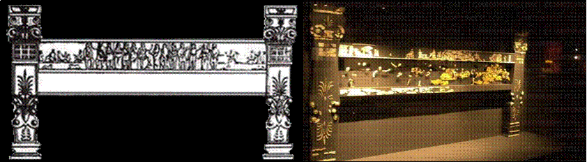 In der Hauptkammer sowie in der Vorkammer, war jeweils eine mit Gold und Elfenbeinschnitzereien verzierte Kline . Sie waren überreichlich mit wertvollen Gegenständen aus Gold, Silber, Bronze und anderen Materialen belegt und zeugen von dem unermesslichen Reichtum des makedonischen Königshaus. |