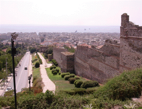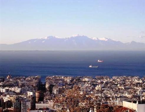 Ost mauer fotografiert vom Trigonius Turm aus, mit Blick über die Rotonda, Altstadt und bei klarer Sicht über den Thermaischen Golf und den mit 2918 Metern höchsten Berg Griechenlands, der Olymp. |