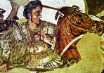 4.) Die neuesten anthropologischen Untersuchungen lassen den Schluss zu, dass in dem Grab tatsächlich König Philipp III. (Arrhidäus) beerdigt ist, und würden erklären, warum einige Archäologen die Anzahl der zahlreichen kostbaren Artefakten in die Zeit von Alexander dem Großen einordnen. Damit wäre dann eindeutig belegt, das die bestattenden männliche Überreste nicht die von Philipp II. sein können. In Verbindung gebracht wird auch eine Theorie under anderem, mit dem wunderbaren wertvollen Zeremonienschild, auf dessen Vorderseite Achilles die tote Penthesileia in den Armen hält, und Olympias die Mutter von Alexanders sich selbst zu den direkten Nachfahren von Achilles zählt. Ebenso der wertvolle Kürass mit den goldenen Reliefbänder und Löwenköpfen der dem von Alexander der Große ähnelt, abgebildet auf dem berühmten Mosaik von Pompei. |
