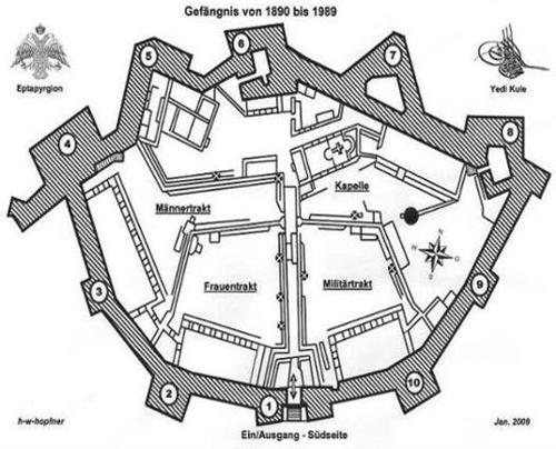 Griechisch (Epta)= 7 Türme, aktuell aber 10 Türme, liegt im nordöstlichen Teil der Stadtmauer innerhalb der Zitadelle. In ihrer heutigen Form zeigt sie sich als byzantinische Festung und als Gefängnis, mit An und Umbauten aus neuerer Zeit innerhalb und außerhalb. Der ursprüngliche Charakter wurde dadurch stark verändert, was sich besonders durch die äußeren Anbauten an der Südseite der Festungsmauer bemerkbar macht.Von 1890 bis 1989 wurde die Festung als Männer, Frauen und Militär Gefängnis benutzt und dann vom Justiz Ministerium an das Kultus Ministerium übergeben. Mit zusätzlichen Geldern der EU wird seit 1990 die Festung restauriert. |