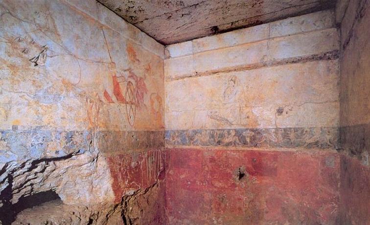 Grab Nr.1 im großen Tumulus, das sogenannte Persephone Grab. Durch die Analyse von Tonscherben aus dem Grab, wird das Alter in die Mitte des 4.Jhr. Anfang des 5. Jhr.v.Chr datiert, und es wird durch seine quadratische Bauart, als ein weiträumiges Kisten oder auch als Schachtgrab bezeichnet. Es besitzt keine Eingänge, sondern wurde von oben mit dem horizontalen hölzernen und mit Steinquader belegten Dach verschlossen. Schon in der Antike geplündert, erinnert heute nur noch die wunderbare Malerei , wahrscheinlich von Nikomachos, an den monumentalen Grab bau der Makedonischen Oberschicht. |