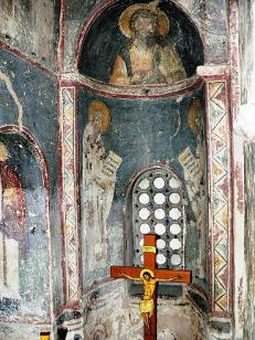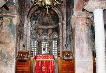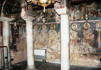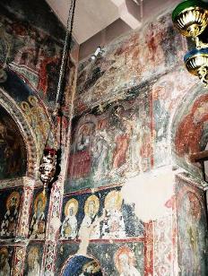 Textfeld: Im 13. Jahrhundert, während der Regierungszeit Kaiser Michael VIII Paleologos /1261-1282, wurde die Kirche repariert und das Holzdach erneuert. Während der Paleologenzeit wurde auch die kleine Kapelle des hl. Euthymios an der Ostseite rechts neben der Apsis angebaut und 1303 vom großen Rittmeister Michael mit Fresken ausgemalt. Nach anderer Auffassung sollen jedoch die Fresken der Kapelle vom großen Ikonenmaler Panselinos geschaffen worden sein. Er war ein bekannter griechischer Maler des Mittelalters und Hauptvertreter der so genannten Makedonischen Schule der Paleologen