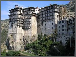 Das siebengeschossige Kloster Simonos Petras ist vielleicht das gewagteste Bauwerk auf dem Berg Athos und eine Perle klösterlicher Architektur. Es wurde vom heiligen Simon gegründet, der Mitte des 13. Jahrhunderts hier lebte. Der Legende nach sah Simon, der hier als Einsiedler lebte, am Weihnachtsabend ein Licht auf dem Gipfel eines steilen Felsens. Er verstand dies als göttlichen Auftrag hier ein Kloster zu errichten. Der Bau begann im Jahre 1362 dank großzügiger Spenden des Serbischen Herrschers Ugliesa. Simon nannte das Kloster wegen seiner Vision am Weihnachtsabend "Neu Betlehem" und erst in späteren Zeiten erhielt es den Namen seines Erbauers. |