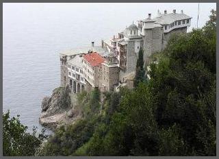 Imposant erhebt sich das Kloster Gregoriou über den Felsen an der Südwestküste der Athos-Halbinsel, in einer herrlichen Gegend zwischen dem Kloster Simonos Petra und dem Kloster Dionysiou. Es wurde im 14. Jh. gegründet und ist dem Heiligen Nikolaos geweiht. Als Gründer des Klosters Gregoriou gilt der Asket Gregorios Sinaitis, dem es auch seinen Namen verdankt. Das heutige Katholikon stammt aus dem Jahr 1768. Die Wandmalereien (1779) sind Werke der Kunstmaler Gabriel und Gregorios aus Kastoria und beeindruckend ist auch das Templon. Im Kloster gibt es zahlreiche Kapellen. |