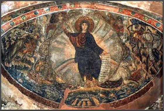 Das Mosaik in der Kuppel von der Apsis, zeigt den bartlosen Christus der dem Profeten Jesekiel erschienen ist. Christus sitzt auf einem vielfarbigen leuchtenden Bogen. Zur Zeit der Ikonenkämpfe wurde das Kunstwerk mit Rinderhäuten bedeckt und durch Zufall erst währen der Regierungszeit des Leontos Armenios ( 813-820 ) wieder entdeckt. Von der Zeit an wurde das Kloster umbenannt und bis zur Türkenherrschaft Christus Sotirios benannt. Zur Zeit der Osmanen wurde das Kunstwerk mit Mörtel verputzt und erst 1921 wieder freigelegt. Die Kirche wurde abermals umbenannt und erhielt den Namen Osios David einen Heiligen und Asketen der aus Thessaloniki stammte. |