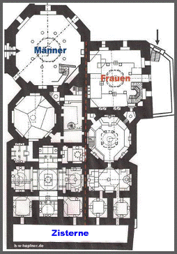 Eine große rechteckige Zisterne flankiert die Bäder zum Osten und garantiert ihre Wasserversorgung. Die Bäder für die Männer schließen den großen achteckig konstruierten Kaltraum mit einer Galerie ein, die auf Säulen getragenen Arkaden ruht umgeben mit Fenster und als Abschluss, mit einer herrlich ausgemalten Kuppel. Direkt daneben der Lauwarm Raum, ebenfalls achteckig und mit einer reich ausgemalten Kuppel. Es folgt der Komplex mit den heißen Bäder und dem in der Mitte liegenden kreuzförmigen Raum mit der Massageabteilung. Die Bäder blieben in Gebrauch, unter dem Namen " Bäder des Paradieses ", bis 1968. Bei dem Erdbeben von 1978, wurde das Bad besonders schwer beschädigt. Wieder hergerichtet dient es heute für kulturelle Veranstaltungen wie kleine Konzerte und Ausstellungen.