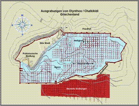 Die archäologisch inzwischen freigelegte, partiell rekonstruierte und für Besucher heute zugängliche Stadt ist ein wichtiges Beispiel für die normierte Ordnung von Grundstücken, Häusern und Strassen. Sie ist inzwischen weitestgehend untersucht und es liegen ausführliche Darstellungen vor. Als ein - in historischer Zeit glücklicherweise wenig verändertes - Beispiel für das hippodamische Stadtbaukonzept und die darin sich architektonisch ausdrückende philosophisch-politische Grundhaltung kann Olynthos einen Einblick in das soziale Leben, Wohnen und Arbeiten, trotz Isonomia differierenden Besitztum und Krieg/Verteidigung, religiöse und politische Ordnung ..., liefern. Das Gelände ist heute durch ein kleines Museum ergänzt; einige wichtige Fundobjekte werden jedoch im Archäologischen Museum von Polygyros bzw. im Archäologischen Museum von Thessaloniki ausgestellt. |