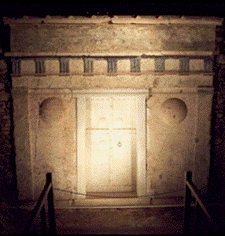 Bei Grab Nr. 3 handelt es sich um das Grab von Prinz Alexander IV., Sohn von Alexander dem Großen und Rhoxane. Mit dem Tod von Alexander IV. endete gleichzeitig die Dynastie der Temeniden.Das Grab selbst, ebenfalls ein 2 Kammergrab ist in seinen Abmessungen kleiner (6,40m.x5m.) als Grab Nr. 2, das Philipp II. zugeordnet wird. Äußerlich unterscheidet sich das Prinzen-Grab zum Philipp-Grab durch eine etwas schlichtere Ausführung. An der Fassade fehlen die zwei dorischen Halbsäulen, und der Fries wird nur von zwei schlichten flachen Eckpilaster getragen. Seitlich neben dem Marmortor sind zwei Schilde die ehemals mit Portraits bemalt waren, genau wie der Fries. Aber leider ist heute von der Bemalung nichts mehr erhalten . |