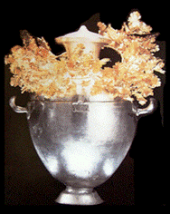 In der Hauptkammer in einem steinernen, wahrscheinlich als Tisch dienendes Behältnis eingelassen, war die aus Silber und mit einem goldenen Eichenlaubkranz behangene Hydria mit der Asche des Toten. Hydria eine Art Wasserkrug, der auch in der Antike von den Griechen gelegentlich für die Aufbewahrung von Totenasche benützt wurde. |
