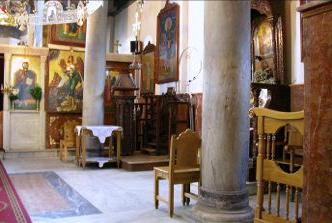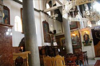 In der Kirchenmitte, an der Nordseite, liegt das Grab des Kirchenstifters Protospatharios oder Katepano (hoher Offizier) Lagoubardias Christoforos. Im Türsturz des Westeingangs ist die Inschrift eingemeißelt: Dieser früher schändlicher Ort wurde von Christoforos dem geehrten königlichen Protospatarios und Katepano der Lagoubardias und von seiner Gattin Maria Katakalis als angesehene Kirche der Gottesgebärerin am 12. Sept. 1028 geweiht. Die Bezeichnung früher schändlicher Ort, bedeutet das die Kirche an der Stelle eines alten Tempels, der den antiken Götter Hephästos oder Kaveiros geweiht war stand. |