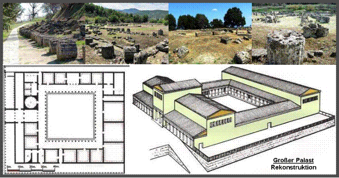 Der Palast, die Tempelanlage die der Göttin Eukleia (Göttin des Ruhmes) geweiht war, das Theater in dem Philipp der II. von seinem Leibwächter Pausanias ermordet wurde, das einzigartige Museum im Großen Tumulus mit den königlichen Gräber, die große Nekropole mit mehr als 200 Gräber aus der Eisenzeit, ( spätes 4., frühes 3., Jhr. vor Chr.), zieht eine große Anzahl von Besuchern an, die sich von der Besonderheit der Entdeckung der ersten makedonischen Hauptstadt, Geburtsort von König Phillip II. und seines Sohnes, Alexander der Große, beeindrucken lassen. Nordwestlich an der Peripherie der Stadt gelegen, findet man zwei makedonische Gräber. „Das Romaios Grab“ mit seiner ionischen Fassade und das Grab der Eurydike“, Mutter von Phillip II. das auf das Jahr 340 v.Chr. datiert wird. Bei dem nahegelegenen Dorf Palatitza befinden sich im sogenannten Bella Tumulus, benannt nach den Bella Brüder auf deren Grundstück die Gräber entdeckt wurden, drei weitere Kammergräber des 5. und 4. Jh. v.Chr.. Der große Palast mit seinem Mittelpunkt, dem Heiligtum des Heracles Patroos und den luxuriösen Banketkammern für den König und seine Kurtisanen, wird ebenfalls in diesen Zeitraum datiert. Das Heiligtum der Eukleia liegt nördlich vom Theater und besteht aus zwei Tempeln aus dem 4. und 3. Jh. v.Chr. Akropolis und die Stadtmauer befinden sich am südlichen Ende des Ortes an einem steilen Hang. Reste von der Mauer erstrecken sich bis in den Osten der antiken Stadt. Die Befestigung von Aigai geht auf die hellenische Periode zurück (spätes 4., frühes 3. Jh. v.Chr.). Alle Sehenswürdigkeiten befinden sich in einer Entfernung von ca. 3 Km. |